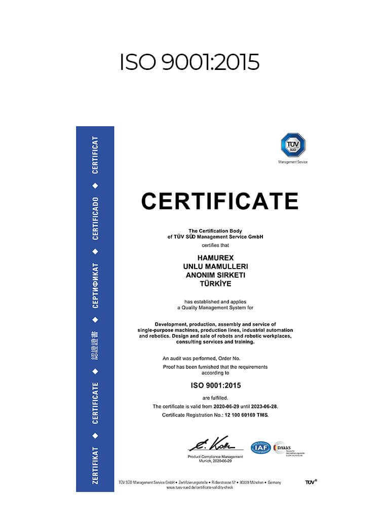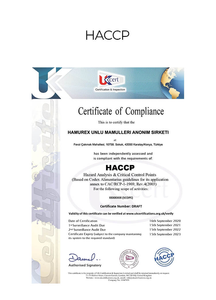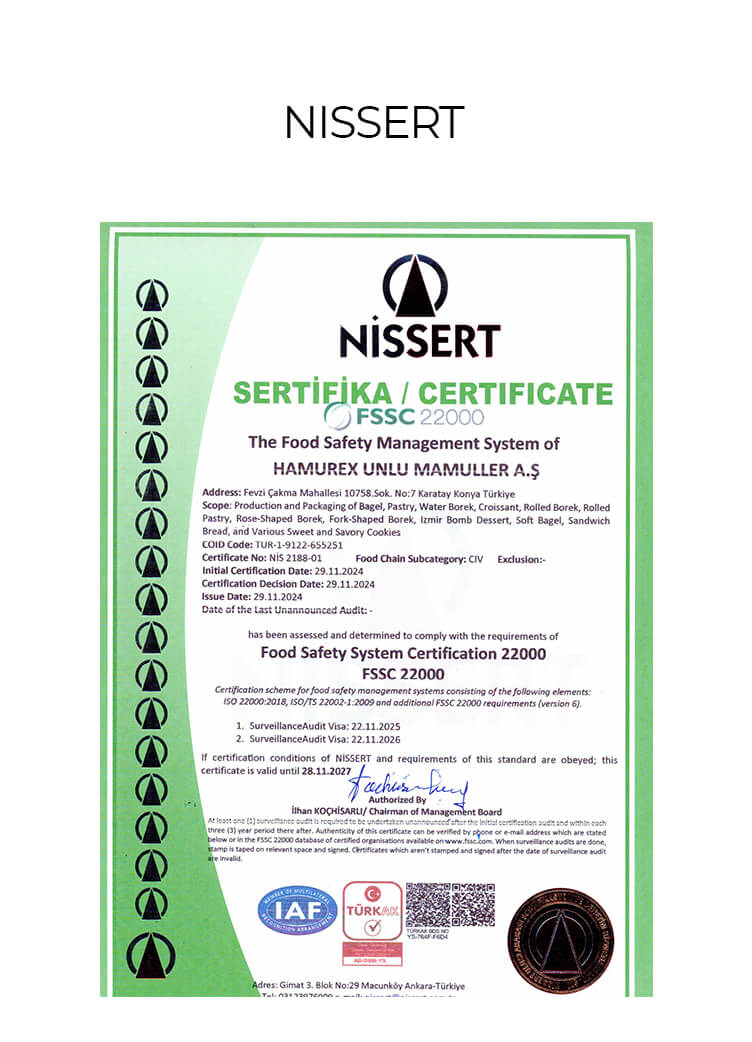 Yasal şartlara ve uygulanabilir diğer şartlara uygun olarak müşteri memnuniyetini sağlamak ve güvenli gıda üretmek amacıyla Hamurex Unlu Mamulleri Anonim Şirketi olarak, tüm birimlerimiz ve çalışanlarımız gıda güvenliği ve kalite hedeflerine ulaşmak için desteklenmekte ve bu kültürü benimsemeleri için gerekli kaynaklar sağlanmaktadır.